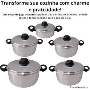 Jogo De Panelas Alumínio conjunto Caçarolas Polido 5 peças jogo de Panelas Polidas - 5 Peças Nº 22, 20, 18, 16 e 14 Transforme sua cozinha com charme e praticidade Este elegante jogo de panelas polidas traz o brilho do alumínio , unindo beleza e funcionalidade para o seu dia a dia. Características: