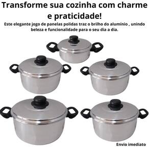 Jogo De Panelas Alumínio conjunto Caçarolas Polido 5 peças jogo de Panelas Polidas - 5 Peças Nº 22, 20, 18, 16 e 14 Transforme sua cozinha com charme e praticidade Este elegante jogo de panelas polidas traz o brilho do alumínio , unindo beleza e funcionalidade para o seu dia a dia. Características: