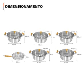 Distribuído por feheros shop jogo de panelas alumínio fundido polido e frigideira 20 cm Atenção As caçarolas são feitas de alumínio fundido polido, oferecendo alta resistência e excelente condução térmica, o que garante cozimento rápido e uniforme. As tampas de vidro com puxadores de madeira permitem acompanhar o preparo com segurança. Para conservar melhor o produto, utilize utensílios de silicone, nylon ou madeira e evite aquecer as peças vazias. Produto seguro, livre de substâncias tóxicas como pfoa. Informações do produto Prepare suas refeições com estilo e eficiência com o jogo de panelas alumínio fundido polido e frigideira 6 peças. Feitas de alumínio fundido batido, essas panelas possuem uma estrutura resistente e distribuem o calor de maneira uniforme. O acabamento polido oferece sofisticação, enquanto o revestimento antiaderente premium facilita o preparo dos alimentos e a limpeza, tornando a experiência mais eficiente e agradável. Especificações técnicas - durabilidade: o alumínio fundido proporciona maior resistência, ideal para o uso diário e intenso. - distribuição uniforme de calor: aquece rapidamente e mantém o calor de forma homogênea, garantindo um cozimento perfeito. - design funcional: a tampa de vidro é prática para monitorar os alimentos enquanto cozinham, sem perder o calor. - fácil limpeza: o acabamento polido impede o acúmulo de resíduos e facilita a remoção de sujeira. - saúde e segurança: material livre de substâncias tóxicas, como pfoa, para garantir a segurança de suas receitas. - versatilidade no cozimento: compatível com fogões a gás, e a lenha. Ideal para qualquer cozinha e tipo de preparação. - eficiência energética: com a sua capacidade de retenção e distribuição de calor eficiente, a frigideira permite que você cozinhe seus alimentos mais rápido, economizando energia e tempo. Ficha técnica do produto - panela caçarola 16 cm: diâmetro: 16 cm x altura: 7,5 cm x capacidade: 1,2 litros - panela caçarola 18 cm: diâmetro: 18 cm x altura: 8 cm x capacidade: 1,650 litros - panela caçarola 20 cm: diâmetro: 20 cm x altura: 8,5 cm x capacidade: 2,6 litros - panela caçarola 22 cm: diâmetro: 22 cm x altura: 9 cm x capacidade: 3 litros - panela caçarola 24 cm: diâmetro: 24 cm x altura: 9,5 cm x capacidade: 3,8 litros - frigideira 20 cm: diâmetro: 20 cm x altura: 6,0 cm - material: alumínio fundido polido - cor: prata - cabo: madeira - tampa: vidro temperado - espessura: entre 3 e 4 mm - compatibilidade: fogões a gás e a lenha Antes do primeiro uso - lave com uma esponja macia e detergente líquido. - seque bem com um pano seco. - aplique uma fina camada de óleo vegetal na parte interna. - leve ao fogo baixo por 2 minutos. - deixe esfriar, lave novamente e seque antes de usar. Após o uso - evite choques térmicos. Deixe o produto esfriar antes de lavar. - lave com água morna e detergente neutro, usando uma esponja macia. - use utensílios de silicone, nylon ou madeira para preservar os produtos. Itens inclusos no pacote - 01 panela caçarola 16 cm - 01 panela caçarola 18 cm - 01 panela caçarola 20 cm - 01 panela caçarola 22 cm - 01 panela caçarola 24 cm - 01 frigideira 20 cm - 06 tampas de vidro com puxadores de madeira Todas as fotos são reais dos produtos. Qualquer dúvida, estamos à disposição Dúvidas frequentes 01 - os produtos são novos Tem 03 - como faço para acompanhar o envio R: ao acessar sua conta, nos detalhes do pedido, estará disponível o código de rastreio para acompanhar a entrega.