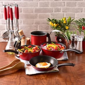 Leve praticidade e estilo para sua cozinha com o conjunto de panelas vermelhas da linha Essencial Multiflon! Com 4 peças produzidas em alumínio, material que proporciona cozimento rápido e uniforme dos alimentos e revestimento interno e externo antiaderente, este é um jogo de panelas durável, resistente e perfeito para utilização no dia a dia. Composto por uma frigideira, uma leiteira e duas panelas com tampas de vidro temperado com saída de vapor que auxiliam no preparo e na visualização dos alimentos.