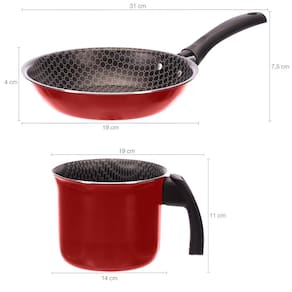 Garantia: 90 Dias/ Peso: 1,73Kg / Cores: Preto e vermelho / Ref: 40009 Dimensões da panela grande: 34,5cm (C) x 18cm (D) x 12,5cm (A) Capacidade: 1,70 Litros. Dimensões da panela pequena: 30cm (C) x 16cm (D) x 12cm (A) Capacidade: 1,10 Litros. Dimensões do fervedor: 19cm (C) x 14cm (D) x 11cm (A) Capacidade: 1,10 Litros. Dimensões da frigideira: 31cm (C) x 19cm (D) x 7,5cm (A) Capacidade: 700ml.