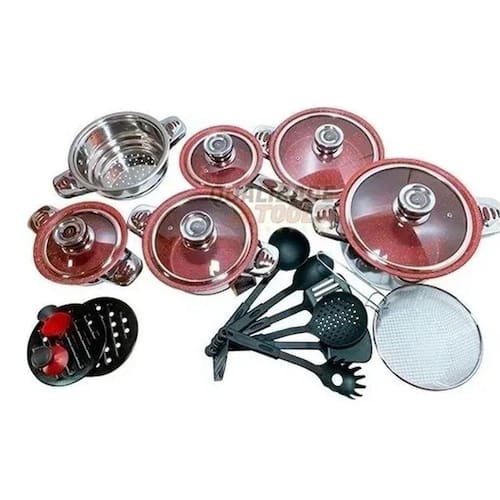 Jogo De Panelas ANTIADERENTE - Aço Cirúrgico 23 Peças - Luxo Jogo com 23 peças. Fabricação alemã com certificado de garantia mundial. As peças são em aço cirúrgico com tampa de vidro temperado, fundo em 9 camadas com revestimento cerâmico e antiaderente. Todas as tampas são equipadas com termômetro / termostato. Aço inoxidável 18/10. Relação das peças: 1 Caçarola 6,5 litros medindo 24cmX14cm com tampa de vidro temperado 1 Caçarola 3,0 litros medindo 20cmX10cm com tampa de vidro temperado 1 Caçarola 1,6 litros medindo 16cmX8cm com tampa de vidro temperado 1 Frigideira 3,05 litros medindo 24cmX6,5cm com tampa de vidro temperado 1 Panela 1,6 litros medindo 16cmX9cm com tampa de vidro temperado 1 Panela vaporizadora medindo 20cmX10cm sem tampa 1 Fritadeira medindo 18cm 1 Bacia para misturas medindo 20cmX6cm com tampa plástica 2 Suporte de panelas em bakelite 1 Conjunto de utensílios de cozinha com 6 peças em nylon 1 Botão de sucção Acompanha ainda um livro de receitas escrito em 3 línguas Alemão, Inglês e Russo , além de um Cartão de Certificação da fábrica. Peso aproximado do conjunto é de 11,5Kgs. Temos uma linha inteira de ferramentas e Maquinas com os melhores preços do Brasil. Temos todos tipos de ferramentas para construção e decoração. São Mais De 300 Tipos de Ferramentas. Garantia Contra Defeitos de Fabricação Atendemos todo o Brasil
