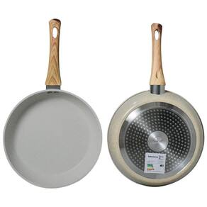 É composto por duas caçarolas, duas panelas com cabo e uma frigideira, todos em alumínio bege com granilite brancos e revestimento cerâmico na cor bege claro.