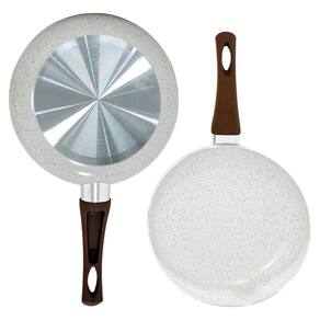 É composto por duas caçarolas, duas panelas com cabo e duas frigideiras, todos em alumínio com revestimento cerâmico na cor vanilla e granilites marrons.