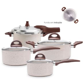 Toda cozinha precisa de uma Panela prática e que favoreça uma alimentação saudável A panela com tampa e fundo de indução da linha Granada, feita para você passar menos tempo preparando suas receitas e cozinhando de forma mais segura em todos os tipos de fogões.Com antiaderente Pro Ceramic Premium, a caçarola é resistente e livre de metais pesados e elementos químicos prejudiciais à saúde, exigindo menos uso de óleo no preparo das refeições, não deixando os alimentos grudarem, facilitando a limpeza e consumindo menos energia. Mais resistente e durável, a caçarola cozinha os alimentos por igual e rapidamente, facilita a visualização dos ingredientes sem prejudicar o cozimento, o cabo com revestimento Soft-Touch, não esquentam durante o uso e têm toque macio. Nesta versão, a panela tem otimo acabamento. Sua pintura externa é na cor Vanilla.Composição do Kit:1 panela Caçarola Indução Brinox 20cm Vanilla,1 panela Indução Brinox 16cm Vanilla,1 panela Indução Brinox 18cm Vanilla,1 panela de Pressao Brinox 6,8L Indução Vanilla.