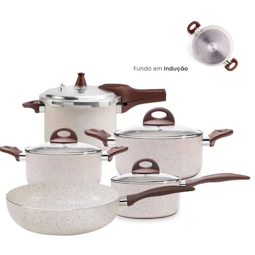 Toda cozinha precisa de uma Panela prática e que favoreça uma alimentação saudável A panela com tampa e fundo de indução da linha Granada, feita para você passar menos tempo preparando suas receitas e cozinhando de forma mais segura em todos os tipos de fogões. Com antiaderente Pro Ceramic Premium, a caçarola é resistente e livre de metais pesados e elementos químicos prejudiciais à saúde, exigindo menos uso de óleo no preparo das refeições, não deixando os alimentos grudarem, facilitando a limpeza e consumindo menos energia. Mais resistente e durável, a caçarola cozinha os alimentos por igual e rapidamente, facilita a visualização dos ingredientes sem prejudicar o cozimento, o cabo com revestimento Soft-Touch, não esquentam durante o uso e têm toque macio. Nesta versão, a panela tem otimo acabamento. Sua pintura externa é na cor Vanilla. Composição do Kit: 1 panela Caçarola Indução Brinox 24cm Vanilla, 1 panela Indução Brinox 18cm Vanilla, 1 panela Indução Brinox 16cm Vanilla, 1 frigideira WOK Indução Brinox s/Tampa 28cm Vanilla 1 panela de Pressao Brinox 4,2L Indução Vanilla. Marca: Não Informado Ean: 7843978101422