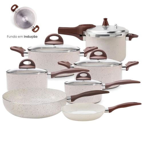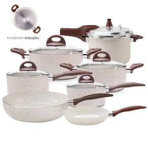 Toda cozinha precisa de uma Panela prática e que favoreça uma alimentação saudável A panela com tampa e fundo de indução da linha Granada, feita para você passar menos tempo preparando suas receitas e cozinhando de forma mais segura em todos os tipos de fogões. Com antiaderente Pro Ceramic Premium, a caçarola é resistente e livre de metais pesados e elementos químicos prejudiciais à saúde, exigindo menos uso de óleo no preparo das refeições, não deixando os alimentos grudarem, facilitando a limpeza e consumindo menos energia. Mais resistente e durável, a caçarola cozinha os alimentos por igual e rapidamente, facilita a visualização dos ingredientes sem prejudicar o cozimento, o cabo com revestimento Soft-Touch, não esquentam durante o uso e têm toque macio. Nesta versão, a panela tem otimo acabamento. Sua pintura externa é na cor Vanilla. Composição do Kit: 1 panela Caçarola Indução Brinox 20cm Vanilla, 1 panela Caçarola Indução Brinox 24cm Vanilla, 1 panela Indução Brinox 16cm Vanilla, 1 panela Indução Brinox 18cm Vanilla, 1 frigideira Indução Brinox 20cm Vanilla, 1 panela de Pressao Brinox 6,8L Indução Vanilla, 1 frigideira WOK Indução Brinox s/Tampa 28cm Vanilla. Marca: Não Informado