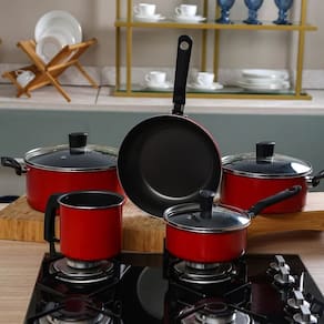 Com estrutura de alumínio que dissipa melhor o calor, cozinhando o alimento por igual, o conjunto de panelas é composto por 5 peças: uma caçarola com tampa 22x10 e 3,4 litros , duas panelas com tampa de 18x8 e 1,75 litro e 16x7 cm e 1,2 litro, uma frigideira de 20x4cm e 0,8 litro e um fervedor de 12x11,5cm e 1,2 litro. O revestimento interno é antiaderente, não deixando o alimento grudar, mesmo com uso reduzido de óleo o que torna a limpeza mais fácil. Os cabos de baquelite não aquecem, tornando o manuseio dos utensílios mais fácil e seguro. As caçarolas e panelas, disponíveis na cor vermelho, ainda possuem tampa de vidro temperado com saída para o vapor. O ciclo de vida do produto pode variar conforme frequência e intensidade da utilização.