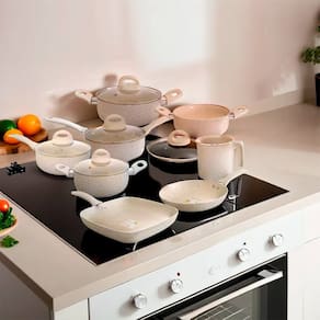 O Conjunto Casambiente 8 peças é indicado para fogões a gás, vitrocerâmico ou elétrico, é composto por duas caçarolas, duas panelas com cabo, uma frigideira, uma frigideira para ovo, uma bistequeira e uma leiteira, todos em alumínio na cor vanilla com revestimento cerâmico preto marble.