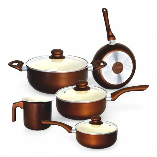 Composto por 1 Frigideira, 1 Leiteira, 2 Panelas e 1 Caçarola. Cor externa Prata Acetinada com interno antiaderente cerâmico na cor creme. Livre dos componentes PTFE e PFOA. Servem para fogões a gás e elétrico. Alumínio com Espessura 2mm. Revestimento Antiaderente Cerâmico na cor creme. Não Gruda, basta seguir as orientações de curagem. Cabos e alças siliconadas resistentes ao calor com tema madeira. Tampas em Vidro Temperado com saída de vapor e bordas em aço inoxidável. Fácil de limpar, podem ir à lava-louças