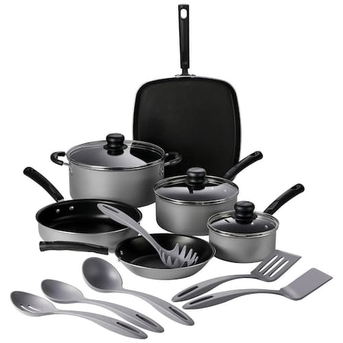 Componentes Inclusos: Frigideira, Grelha quadrada, Frigideira funda aberta, Panela de cozimento de 1 litro com tampa, Panela de cozimento de 2 litros com tampa, Panela de cozimento holandesa de 4 litros com tampa, 6 Utensílios de Nylon,