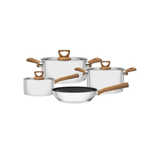 Jogo de Panelas Brava com Caçarola e Frigideira em Aço Inox Antiaderente 1,4L 2,4L 2,9L 4,7L Amadeirado