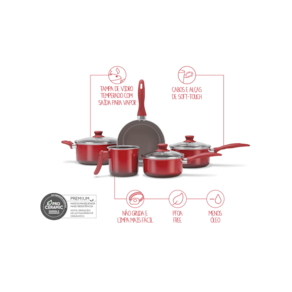 Que tal aliar uma cozinha linda a alimentos saudáveis? A linha Smart faz isso por você! Com a nova geração de antiaderente cerâmico: a Pro Ceramic Premium, as peças da linha Smart estão mais resistentes, livres de metais pesados e elementos químicos prejudiciais à saúde, exigem menos uso de óleo no preparo das refeições, não deixam os alimentos grudarem, facilitam na limpeza e consomem menos energia. Na parte externa, o charme da pintura siliconada colorida e das alças com revestimento Soft-Touch, de toque macio e que não esquentam durante o uso, além das tampas de vidro temperado com saída para o vapor, para espiar a comida sem prejudicar o cozimento. Nesta versão, a cor da pintura é vermelha. O conjunto pode ser utilizado nos fogões: fogão à gás (comum), vitrocerâmico e elétrico. A linha Smart possui corpo de 2,0 mm de espessura em alumínio.