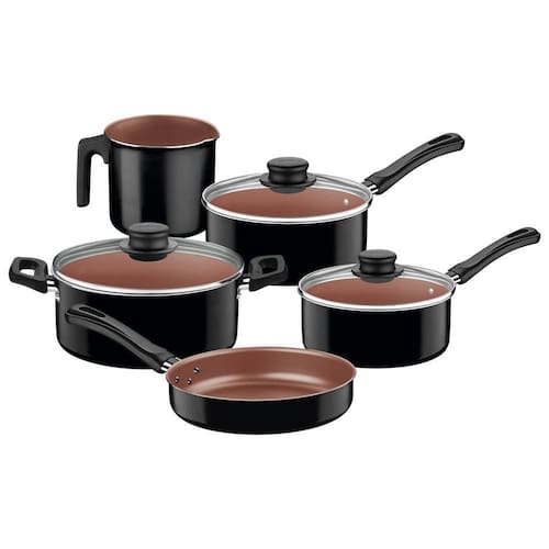 Prepare suas receitas do dia a dia com o jogo de panelas Tramontina Caribe, ideal para a rotina na cozinha. As peças em alumínio com espessura adequada proporcionam cozimento rápido e uniforme dos alimentos, trazendo mais praticidade. O revestimento interno antiaderente Starflon Max evita que os alimentos grudem, facilita a limpeza e oferece maior durabilidade, enquanto o revestimento externo em poliéster contribui para um visual moderno. As tampas de vidro temperado com borda em aço inox permitem acompanhar o preparo sem abrir a panela, e cabos, alças e pegadores antitérmicos garantem segurança no manuseio. Um conjunto versátil para uso doméstico que reúne frigideira, panelas, caçarola e fervedor em um só kit.