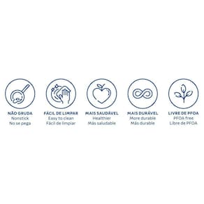 Conteúdo da embalagem: 1 frigideira 20 cm 1,4 L; 1 panela 16 cm 1,4 L; 1 panela 18 cm 2 L; 1 caçarola 20 cm 2,8 L; 1 fervedor 12 cm 1,2 L