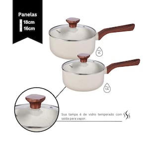 - prático: as panelas do conjunto funcionam em fogões a gás em fogo baixo , elétrico, vitrocerâmico e de indução. Seu material permite a condução rápida e eficiente do calor, sendo a temperatura baixa ou média suficiente para cozinhar os alimentos, reduzindo o consumo de gás e energia.