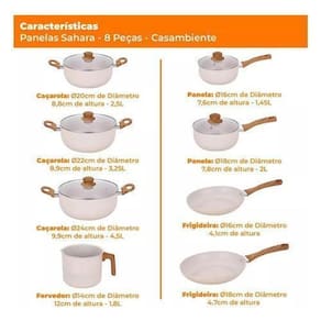 Jogo de panelas antiaderente revestimento cerâmica vanilla sahara 9 peças - casambiente al177 possui revestimento antiaderente em cerâmica e 2,0mm espessura em sua estrutura, o que melhora o preparo de seus alimentos, pois a temperatura é dissipada de maneira uniforme e favorece o cozimento, evitando que sua comida queime facilmente. 1 caçarola 24cm 1 caçarola 22cm 1 caçarola 20cm 1 panela 18cm 1 panela 16cm 1 frigideira 18cm 1 frigideira 16cm 1 fervedor 14cm Panela 4,2l - segurança, praticidade e design Capacidade: 4,2 litros - ideal para preparos do dia a dia para a família. Revestimento: antiaderente cerâmico - fácil limpeza, preparo saudável sem grudar. Compatibilidade: funciona em todos os tipos de fogão elétrico, gás, vidro, indução - verificar se há necessidade de disco difusor . Segurança máxima: válvula de segurança e sistema de travamento automático da tampa. Conforto: cabo anatômico para manuseio seguro e firme. Design: acabamento marmorizado, moderno e sofisticado para a sua cozinha. Funcionalidade: sistema para cozimento rápido e uniforme. Perfeita para quem busca praticidade sem abrir mão da segurança e do estilo Recomendações: - lavar antes do primeiro uso, untar com óleo e aquecer antes da primeira utilização. - usar somente utensílios de madeira, silicone ou nylon. - utilizar fogo médio ou baixo, pois as panelas distribuem uniformemente o calor. - não esquentar o produto vazio. - utilizar o lado macio da esponja e evitar uso de abrasivos - indicado para fogão a gás, elétrico. Não indicado para fogão de indução Marca: Não Informado Ean: 7896908986941