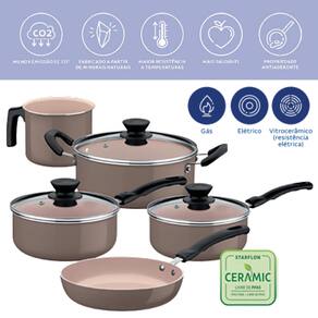 Jogo de Panelas Tramontina Évora em Alumínio com Revestimento Interno Cerâmico e Externo de Silicone Capuccino 5 Peças + Kit de Utensílios Não Risca a Panela 4 peças Tramontina em Nylon Preto + Jogo de Facas Tramontina Plenus com Lâminas em Aço Inox e Cabos de Polipropileno Preto 04 Peças