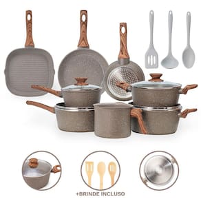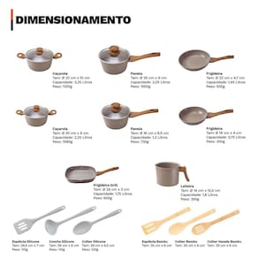 Distribuído por feheros shop Jogo de panelas completo 11 peças 4mm cerâmico premium indução Atenção As panelas com revestimento cerâmico possuem propriedades antiaderentes, mas não são 100% antiaderentes. Para melhores resultados, recomenda-se o uso de pequenas quantidades de óleo. O revestimento cerâmico é uma alternativa saudável e ecológica, pois não libera substâncias tóxicas quando aquecido. - panelas premium com certificação inmetro nível a - não deixe a chama do fogão pegar nas laterais das panelas - leia atentamente a descrição e siga as recomendações do fabricante Informações do produto Este conjunto completo oferece versatilidade e sofisticação para a sua cozinha. Compatível com todos tipos de fogão, inclusive por indução, suas peças são fabricadas com revestimento cerâmico de alta qualidade, que garante durabilidade, resistência e maior segurança alimentar. Livre de pfoa e ptfe, é uma opção saudável e sustentável. O design moderno com acabamento premium valoriza o ambiente e proporciona aquecimento rápido e uniforme, otimizando o tempo de preparo e reduzindo o consumo de energia. Especificações técnicas - compatível com fogões a gás, elétricos, vitrocerâmicos e de indução - revestimento cerâmico em 3 camadas com espessura de 4 mm - cabo de baquelite com revestimento soft touch, confortável e seguro - livre de pfoa e classificado como nível a no inmetro - fundo triplo com base de indução: estrutura que combina alumínio e revestimento cerâmico - revestimento: 2 camadas cerâmicas + 1 camada resistente a alta temperatura Ficha técnica do produto - panela 16 cm: d 16 cm x a 8,5 cm c 1300 ml p 730 g - panela 20 cm: d 20 cm x a 9 cm c 2250 ml p 1050 g - caçarola 20 cm: d 20 cm x a 9 cm c 2250 ml p 1080 g - caçarola 22 cm: d 22 cm x a 10 cm c 3250 ml p 1350 g - leiteira 14 cm: d 14 cm x a 10,5 cm c 2000 ml p 350 g - frigideira 18 cm: d 18 cm x a 4 cm c 750 ml p 300 g - frigideira 22 cm: d 22 cm x a 4,7 cm c 1450 ml p 500 g - frigideira grill 24cm: 24 cm x 24 cm a 3 cm p 600g - colher silicone 29 cm: 29 cm x l 6,5 cm p 120 g - concha silicone 29 cm: 29 cm x l 9 cm p 110 g - espátula vazada silicone 29,5 cm: 29,5 cm x l 7 cm p 110 g Importante: d = diâmetro, a = altura, c = capacidade, p = peso Antes do primeiro uso - lave com esponja macia e detergente - seque com pano macio - aplique um pouco de óleo na parte interna - leve ao fogo baixo por 2 minutos - desligue o fogo e espere esfriar - lave novamente e seque Após o uso - evite choques térmicos. Deixe esfriar antes de lavar - lave à mão com água morna, esponja macia e detergente - enxágue e seque com pano macio - para alimentos queimados, deixe de molho e lave - não utilize utensílios metálicos, objetos afiados ou produtos abrasivos Itens inclusos no pacote - 01 panela 16 cm com tampa de vidro - 01 panela 20 cm com tampa de vidro - 01 caçarola 20 cm com tampa de vidro - 01 caçarola 22 cm com tampa de vidro - 01 leiteira 14 cm - 01 frigideira 18 cm - 01 frigideira 22 cm - 01 frigideira grill quadrado 24cm - 01 colher silicone 29 cm premium - 01 concha silicone 29 cm premium - 01 espátula vazada silicone 29,5 cm premium acompanha - 01 espátula vazada de bambu - 01 colher vazada de bambu - 01 colher para arroz de bambu Todas as fotos são reais dos produtos. Qualquer dúvida, estamos à disposição Dúvidas frequentes 01 - o produto pode ir ao forno R: não, este conjunto não é adequado para uso no forno devido ao cabo em baquelite 02 - o produto é novo Possui 03 - é compatível com fogão de indução R: sim, o conjunto possui fundo especial que permite o uso em fogões de indução, além de fogões a gás, elétricos e vitrocerâmicos