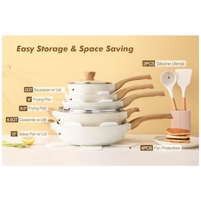 Apresentamos o Conjunto de Panelas de Cerâmica SENSARTE, a escolha saudável para a sua cozinha. Com superfície cerâmica antiaderente 100% não tóxica, livre de PFOA, PTFE, PFAS, PFOS, grafite, cádmio e outras substâncias nocivas. Seu revestimento cerâmico natural é mais saudável que o revestimento de Teflon, resistente a riscos e libera os alimentos com facilidade. Requer menos óleo para cozinhar, promovendo uma dieta saudável e com baixo teor de gordura. O conjunto inclui frigideiras , panela para refogar com tampa, caçarola com tampa, panela com tampa, 2 utensílios multiuso e 4 protetores de panela. Fácil de limpar, basta passar um papel toalha ou enxaguar com água. Compatível com indução e todos os tipos de fogões. O fundo de aço inoxidável permite aquecimento rápido e uniforme, sem deformações. Com alça StayCool e tampa de vidro resistente a explosões para cozinhar com tranquilidade.