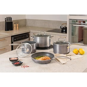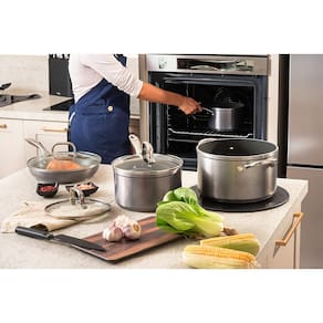A frigideira conta com revestimento Mineral Resist com partículas de cerâmica ultra resistentes ao uso em altas temperaturas. As tampas em vidro temperado com saída para vapor e borda em aço inox, além dos acessórios em aço inox fixados por rebite, oferecem durabilidade, segurança e sofisticação. Compatível com todos os tipos de fogão, inclusive indução.