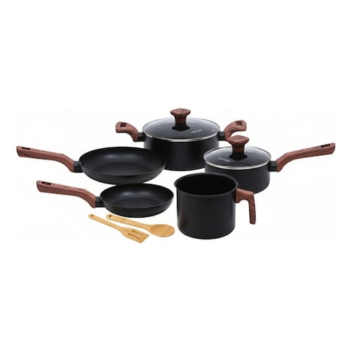 O conjunto inclui uma caçarola de 20 cm, uma panela de 16 cm, duas frigideiras de 20 cm e 16 cm, uma leiteira de 14 cm, uma espátula vazada e uma colher de arroz. Fabricado em alumínio, cada peça possui um revestimento antiaderente que facilita o cozimento e a limpeza, tornando suas experiências culinárias ainda mais agradáveis.