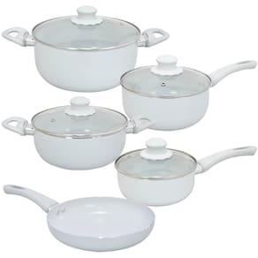 É composto por duas caçarolas, duas panelas com cabo e uma frigideira, todos em alumínio com revestimento cerâmico na cor cinza com granilite branco.