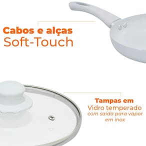 As peças do conjunto possuem cabos e alças com acabamento siliconado Soft-Touch também na cor cinza, que dão um toque macio e não esquentam, evitando acidentes.