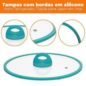 As tampas são de vidro temperado com saídas para vapor em inox e bordas em silicone , trazendo um design inovador, ideais para você que gosta de sofisticação e elegância em sua cozinha.