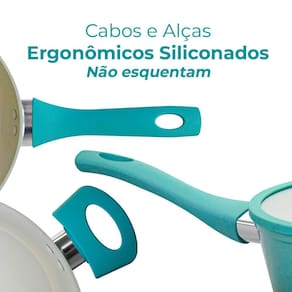 As peças do conjunto possuem cabos e alças com acabamento siliconado Soft-Touch verde água, que dão um toque macio e não esquentam, evitando acidentes.