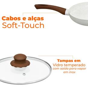As peças do conjunto possuem cabos e alças com acabamento siliconado Soft-Touch na cor marrom, que dão um toque macio e não esquentam, evitando acidentes.