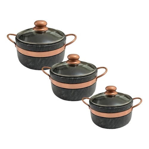 JOGO DE PANELAS DE PEDRA SABÃO 3 PEÇAS TAMPA DE VIDRO E PEGADOR COBREADO EXCLUSIVO