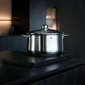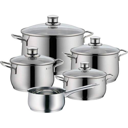 Desenvolvida pela alemã WMF, o conjunto de panelas Diadem conta com 5 panelas fabricadas em aço inox Cromargan 18/10 material exclusivo da marca que proporciona brilho permanente, funcionalidade e durabilidade em suas mãos. Seu fundo conta com a tecnologia Transterm melhor distribuição de calor que permite uma economia de até 40% de energia. Podem ser utilizadas em diversos métodos de aquecimento, incluindo indução, além disso, possui tampas de vidro que facilitam a visualização no preparo do alimento. A linha Diadem combina elegância, resistência, segurança e qualidade em cada peça produzida.