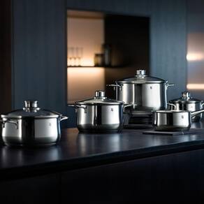 Desenvolvida pela alemã WMF, o conjunto de panelas Diadem conta com 5 panelas fabricadas em aço inox Cromargan 18/10 material exclusivo da marca que proporciona brilho permanente, funcionalidade e durabilidade em suas mãos. Seu fundo conta com a tecnologia Transterm melhor distribuição de calor que permite uma economia de até 40% de energia. Podem ser utilizadas em diversos métodos de aquecimento, incluindo indução, além disso, possui tampas de vidro que facilitam a visualização no preparo do alimento. A linha Diadem combina elegância, resistência, segurança e qualidade em cada peça produzida.