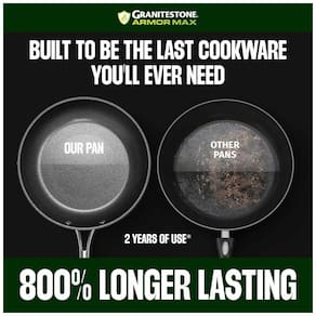 NADA FICA: Pense em alimentos mais saudáveis, fácil liberação de alimentos e limpezas sem esforço com Granitestone Armor Max Cada peça de panela possui um revestimento antiaderente de ultra liberação de 4 camadas projetado para deslizar os alimentos imediatamente e durável o suficiente para suportar qualquer utensílio de metal, espátulas, colheres , batedeiras e até batedores elétricos