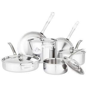 Um exclusivo da O conjunto inclui frigideiras de 20, e 25,, panela de molho de 1,5 litros com tampa de 2,25 litros e panelas de molho de 3 litros com tampas, 8 potes de caldo com tampa. Este conjunto de panelas e frigideiras de 10 peças apresenta um acabamento espelhado. Alças sólidas de aço inoxidável fundido com rebites de aço inoxidável para uso vitalício.