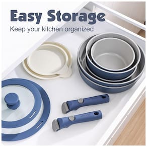Armazenamento Fácil e Compacto: Com design empilhável e alças removíveis, este conjunto de panelas e frigideiras economiza até 70% de espaço. Ideal para armários ou até trailers, você pode organizar sua cozinha de maneira eficiente e sem ocupar muito espaço.