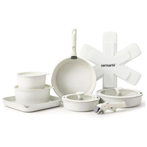 Armazenamento Fácil e Compacto: Com design empilhável e alças removíveis, este conjunto de panelas e frigideiras economiza até 70% de espaço. Ideal para armários ou até trailers, você pode organizar sua cozinha de maneira eficiente e sem ocupar muito espaço.