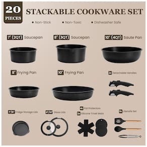 Alças Removíveis para Armazenamento Compacto: O design de alças removíveis oferece um armazenamento prático e eficiente, economizando até 70% do espaço no armário ou gavetas. Perfeito para cozinhas pequenas, trailers ou apartamentos. As alças reforçadas suportam até 10,8 kg (24 libras), oferecendo segurança e confiança ao cozinhar.