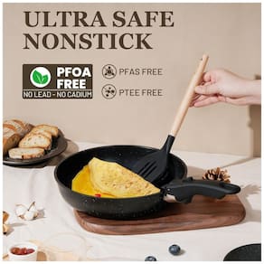 Não Tóxico: Com revestimento livre de PTFE, PFAS, PFOA e outros produtos químicos prejudiciais, nosso conjunto de utensílios de cozinha não tóxicos é ideal para quem busca saúde e segurança na cozinha. Resistente ao desgaste, ele não descasca, mesmo com uso prolongado. Perfeito para preparar refeições para a família, incluindo as de bebês.
