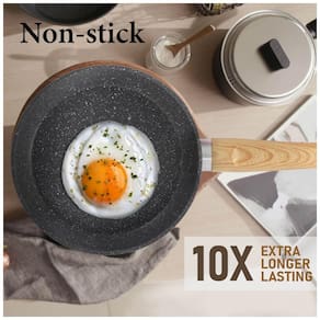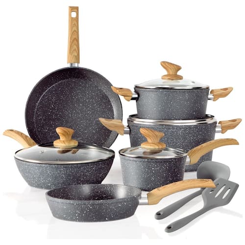 Conjunto de panelas e frigideiras antiaderentes Ao comprar panelas, uma das coisas importantes são as capacidades antiaderentes. O revestimento de granito faz um bom trabalho evitando que os alimentos grudem. Além disso, você poderá preparar refeições mais saudáveis para sua família, já que não precisará usar tanto óleo. Você pode cozinhar molho de tomate com segurança em panelas de granito o sabor e o cheiro da comida não mudarão, mesmo se você usar ingredientes ácidos ou com cheiro forte.