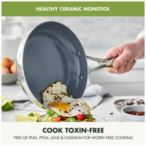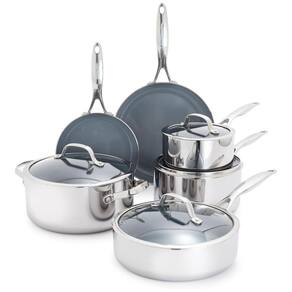 Este poderoso conjunto oferece toda a beleza do aço inoxidável com uma incrível facilidade antiaderente. Finalizado com o revestimento cerâmico Infinite8, o mais avançado da GreenPan, este conjunto de aço inoxidável pode grelhar como um clássico de 3 camadas e depois limpar facilmente. O acabamento espelhado único nos corpos de aço inoxidável de 3 camadas deste conjunto adiciona estilo impressionante a qualquer cooktop. O conjunto inclui frigideira de 20cm, frigideira de 25cm, panela de saltear de 3 litros com tampa, panela de 1,5 litros com tampa, panela de 3 litros com tampa e panela de 4,7 litros com tampa. O Thermolon Infinite8 é o revestimento cerâmico mais avançado da GreenPan, seguro para utensílios de metal, livre de PFAS, PFOA, grafite e cádmio. O design em aço inoxidável de 3 camadas e espelhado oferece uma transferência de calor fantástica, fácil grelhar e melhor dourar. As bordas resistentes a impactos são especialmente projetadas para evitar solavancos e lascas onde sua panela mais precisa. As alças de aço inoxidável polido são rebitadas para uma estabilidade extra e transferências fáceis para o forno. Para todos os tipos de cooktops, incluindo indução. Seguro para utensílios de metal. Seguro para forno e grelhador até 315°C. Seguro para lava-louças.