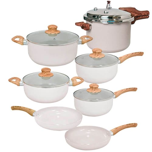 É composto por duas caçarolas, duas panelas com cabo, duas frigideira e uma panelade pressão, todos em alumínio com revestimento cerâmico na cor bege claro.