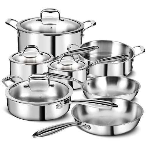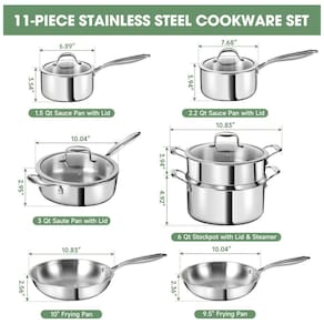 O Conjunto de Panelas em Aço Inoxidável de 3 Camadas com 11 Peças da EWFEN é a escolha perfeita para sua cozinha. Este conjunto inclui panelas e frigideiras com tampas de vidro temperado com bordas largas, garantindo versatilidade. Com tecnologia de múltiplas camadas, o interior em aço inoxidável 304 permite um cozimento seguro e fácil de limpar, o núcleo de alumínio garante aquecimento uniforme e o exterior em aço inoxidável 430 possibilita o uso em todos os tipos de fogões. Cada peça possui um design durável com acabamento espelhado, sendo seguro para máquina de lavar louça. As tampas de aço inoxidável selam a umidade e as alças rebitadas garantem manuseio seguro, enquanto permanecem frias durante o uso. Este conjunto é compatível com fogões a gás, elétricos, de indução e vitrocerâmicos, tornando-o versátil para qualquer cozinha. Os bicos moldados facilitam o despejo de caldos e molhos, enquanto os furos de drenagem integrados facilitam o escorrimento de massa e a separação de sólidos maiores.