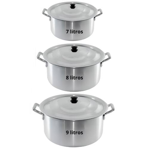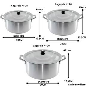 - **Material:** Alumínio de alta qualidade, resistente à corrosão e com excelente condução de calor - **Tamanhos:** Caçarolas nos tamanhos Nº 26, 28 e 30 para atender diferentes necessidades de cozimento - **Espessura:** Boa espessura para evitar deformações, proporcionando durabilidade e eficiência no cozimento - **Alças Reforçadas:** Alças firmes e ergonômicas, facilitando o manuseio seguro mesmo com o utensílio quente - **Versatilidade:** Ideal para preparar variados tipos de pratos, desde refogados e ensopados até carnes e legumes - **Fácil Limpeza:** Superfície de alumínio que facilita a limpeza e economiza tempo na cozinha