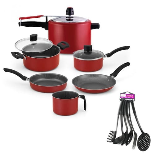 Jogo com 12 peças sendo: Conjunto Enjoy Alegrete 6 Peças com Tampa de Vidro e Panela de Pressão 4,5 Litros. Produtos produzidos em alumínio laminado, revestido interno e externo com antiaderente cabo e alça em baquelite com suporte em metal, tampa em vidro com pomel em baquelite. Conjunto de Utensílios 6 peças feitas em plastico resistente e com funções especificas para diferentes atividades.