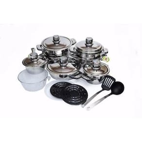 Jogo De Panelas Europeia 23 Pçs para Fogão À Indução - Top Jogo com 23 peças. Fabricação alemã com certificado de garantia mundial. As peças são em aço cirúrgico com tampa de vidro temperado, fundo em 9 camadas com revestimento cerâmico e antiaderente. Todas as tampas são equipadas com termômetro / termostato. Aço inoxidável 18/10. Relação das peças: 1 Caçarola 6,5 litros medindo 24cmX14cm com tampa de vidro temperado 1 Caçarola 3,0 litros medindo 20cmX10cm com tampa de vidro temperado 1 Caçarola 1,6 litros medindo 16cmX8cm com tampa de vidro temperado 1 Frigideira 3,05 litros medindo 24cmX6,5cm com tampa de vidro temperado 1 Panela 1,6 litros medindo 16cmX9cm com tampa de vidro temperado 1 Panela vaporizadora medindo 20cmX10cm sem tampa 1 Fritadeira medindo 18cm 1 Bacia para misturas medindo 20cmX6cm com tampa plástica 2 Suporte de panelas em bakelite 1 Conjunto de utensílios de cozinha com 6 peças em nylon 1 Botão de sucção Peso aproximado do conjunto é de 11,5Kgs. Marca: Sa, Songle, Nakazaki Ou Siga It-Blue