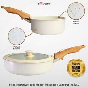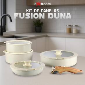 Jogo de Panelas Fusion Duna Extream - Cabo SmartClick e Compatível com Fogão de InduçãoO Kit de Panelas Fusion Duna Extream chegou para revolucionar sua cozinha Com um design sofisticado na cor Duna Bege , este conjunto de 10 peças traz praticidade, inovação e eficiência para o seu dia a dia.Funciona em Fogão por InduçãoO Kit Fusion Duna Extream é totalmente compatível com fogões de indução, além de ser ideal para uso em fogões a gás, elétricos e vitrocerâmicos.Destaques do Produto:- Cabo Destacável SmartClick - Mais praticidade e segurança Facilita o armazenamento, economiza espaço e permite levar as panelas diretamente do fogão ao forno ou à mesa.- Tampas de Plástico para Armazenamento Inteligente - Guarde as sobras das refeições diretamente na panela, mantendo os alimentos frescos por mais tempo.- Revestimento UltraShield Nano Ceramic Antiaderente - Tecnologia cerâmica avançada que impede que os alimentos grudem, tornando o preparo mais saudável e facilitando a limpeza.- Alumínio de Alta Performance - Proporciona um cozimento uniforme, rápido e eficiente.- Versatilidade Total - Use no fogão, no forno sem o cabo , na geladeira e até na mesa para servir com estilo.Itens Inclusos no Kit:1 Frigideira 20cm1 Frigideira Alta 26cm1 Panela 18cm1 Panela 20cm3 Utensílios de Cozinha1 Cabo Destacável SmartClick1 Tampa Plástica 18cm1 Tampa Plástica 20cmAposte na praticidade do cabo destacável, no armazenamento inteligente e na compatibilidade com fogões por indução Marca: Não Informado Ean: 7898946069303