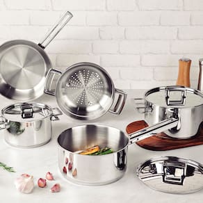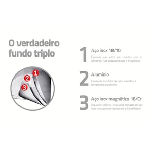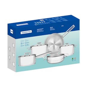 Especificações Gerais do Produto: Pegador / Cabo: Inox Dimensões AxLxP (mm): Caçarola funda Ø 16cm; Caçarola funda Ø 20cm; Cozi-vapore Ø 20cm; Frigideira Ø 24cm; Panela Ø 20cm Cor: Inox Material: Aço Inox Garantia: 90 dias junto ao fabricante Referência: 65400010 Tecnologia da Panela: Fundo Triplo Pode ir à Máquina de Lavar Louças?: Sim Capacidade da Panela: Caçarola funda 1,8L; Caçarola funda 3,6L; Cozi-vapore 2,2L; Frigideira 2,1L; Panela 2,9L Linha: Brava Tipo de Fogão: Gás, elétrico, vitrocerâmico e indução Tampa: Panela e caçarolas: sim, com saída de vapor Pode ir ao forno?: Sim, para gratinar ou finalizar pratos na temperatura máxima de 260°C.