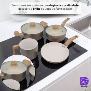 Jogo de Panelas Gold 4 Peças Caçarola Frigideira Fervedor em Alumínio Dourado com Revestimento Cerâmico e Cabo